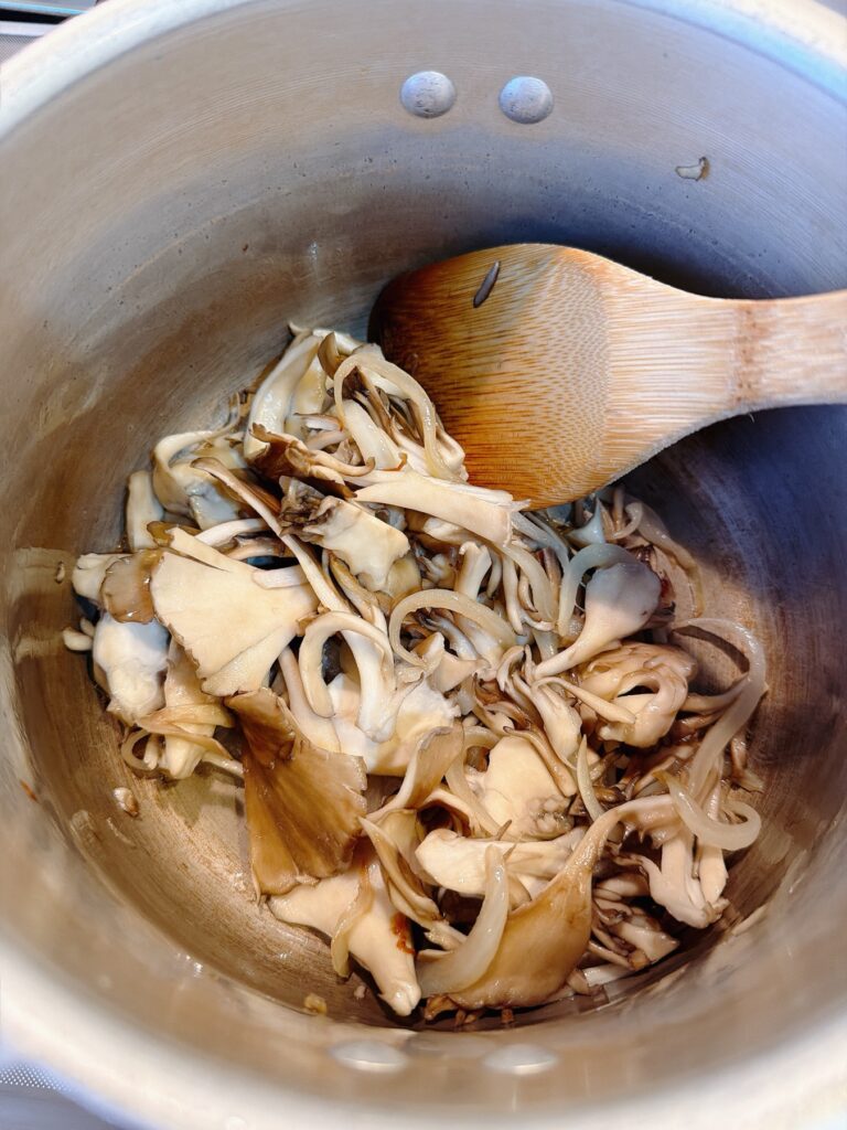 1️⃣鍋にオリーブ油をひきスライスした玉ねぎを炒め、しんなりしたら舞茸を炒める