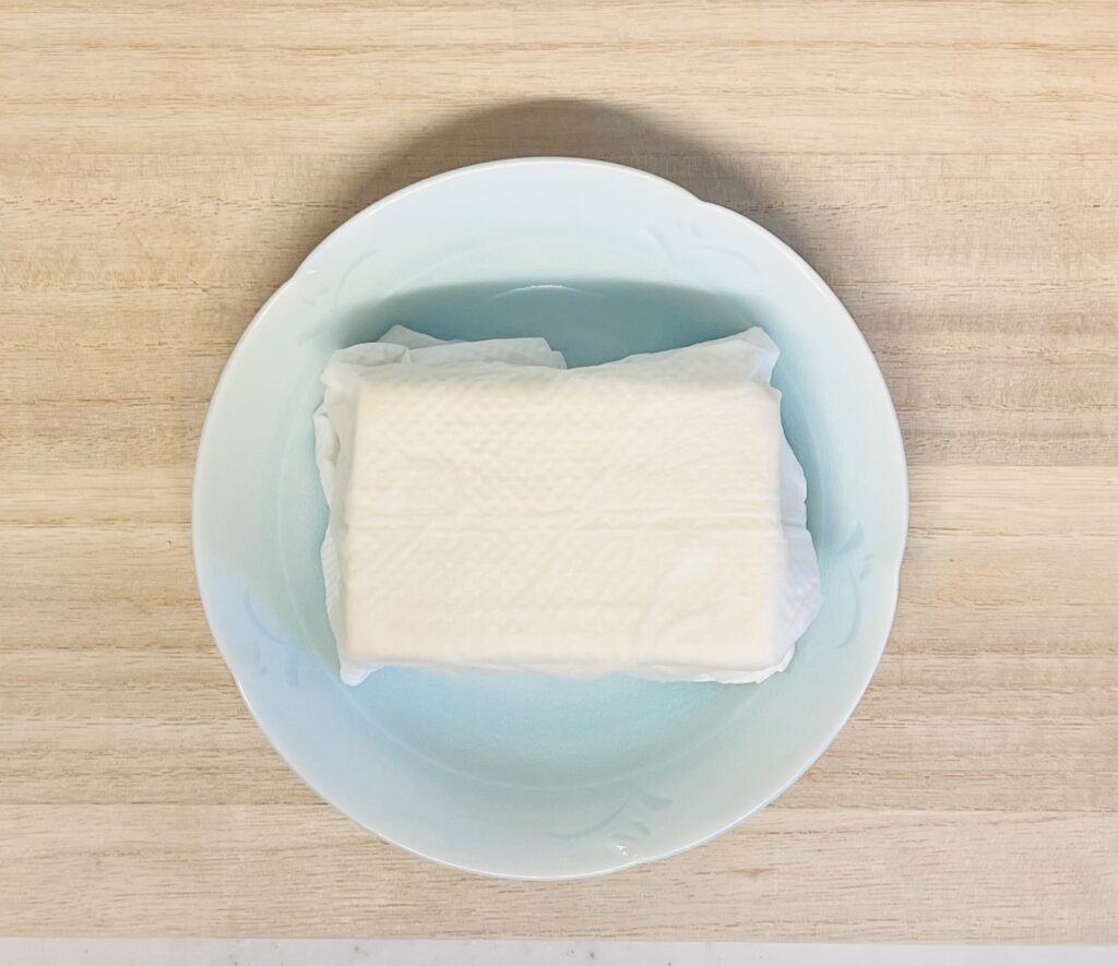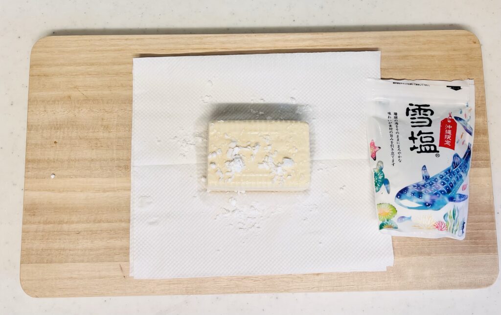1️⃣ 豆腐に塩をふりかけ満遍なくすり込んでキッチンペーパーで包み、冷蔵庫で数時間水出しをする