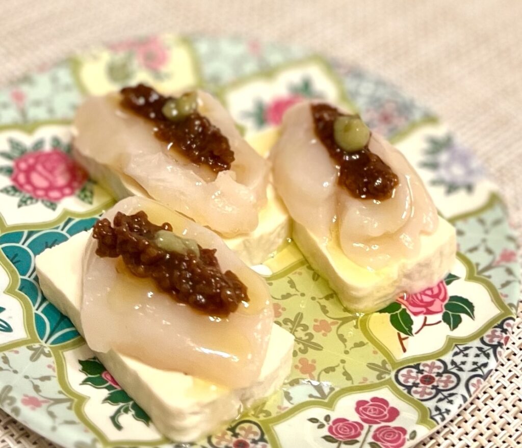 3️⃣ 水切りした豆腐を1cm厚さに切りホタテを載せる